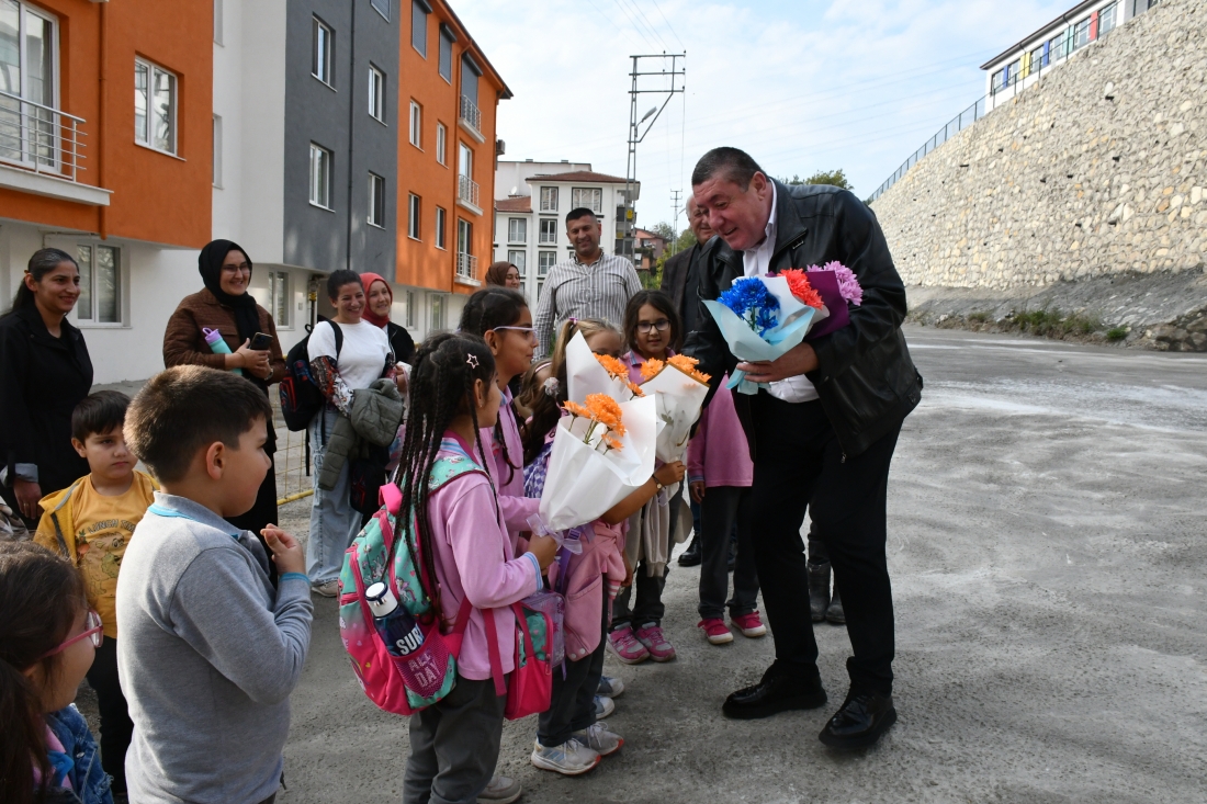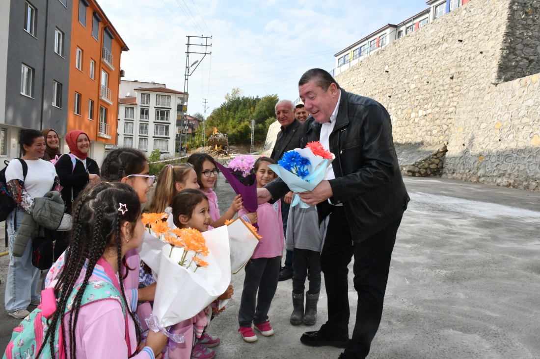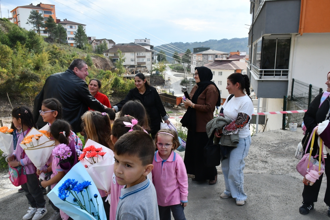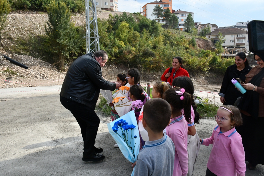 Alaplı Merkez Mahallesi Ihlamur Sokak’ta yeni eğitim öğretim döneminde kapılarını açan Ahmet Zeki Atalay İlkokulu öğrencileri, okul yolu ve mahalle yollarını betonlayarak güvenli hale getiren Alaplı Belediye Başkanı Nuri Tekin’e teşekkür ederek çiçek takdim etti.